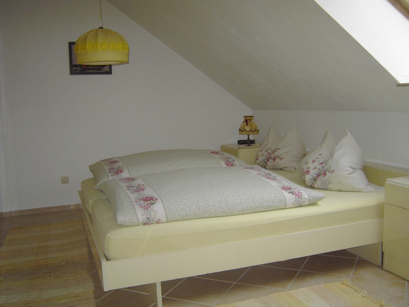 Das Doppelbett im großen Schlafzimmer hat die Ausmaße 2,00m x 2,00m. Das Bett im kleinen Schlafzimmer ist 1,40 x 2,00m groß und steht an der Wand. Das Übereck-Bett im Kinderzimmer ist an einer Seite 2,00 m und an der anderen Seite 2,40 m lang und 0,85m und 0,80m breit. Hier kann auch ganz bequem ein Erwachsener schlafen. |